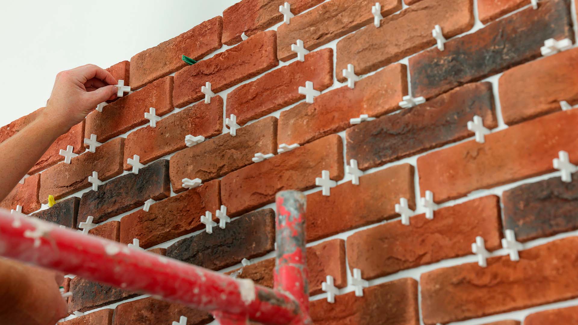 - Apply the bricks from the bottom up and check the level frequently. Start with the corners if there are any (see image below). The entire surface of the brick must be in contact with the adhesive.