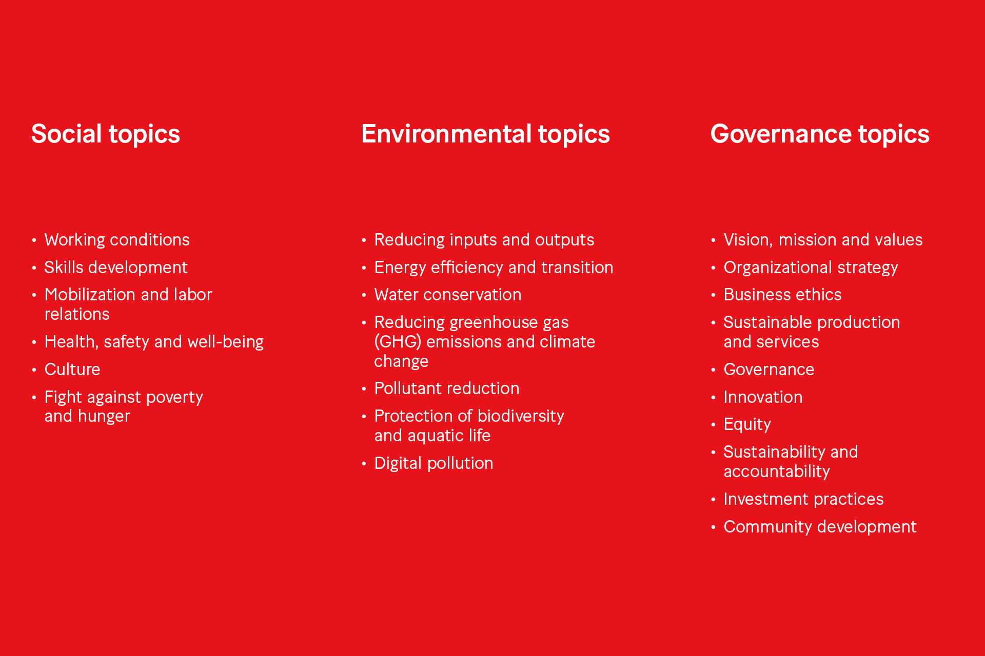 The 6 thematic areas structure the overall ESG (Environmental, Social, and Governance) strategy and correspond to the major topics we want to address: